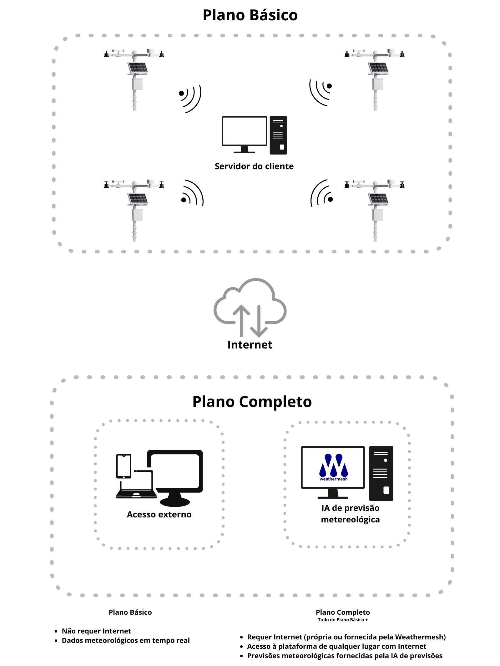 A solução da Weathermesh não requer acesso à Internet no Plano Básico e os dados são enviados para um servidor que processa os processa, apresentando informações meteorológicos locais em tempo real, de acordo com a necessidade do cliente.